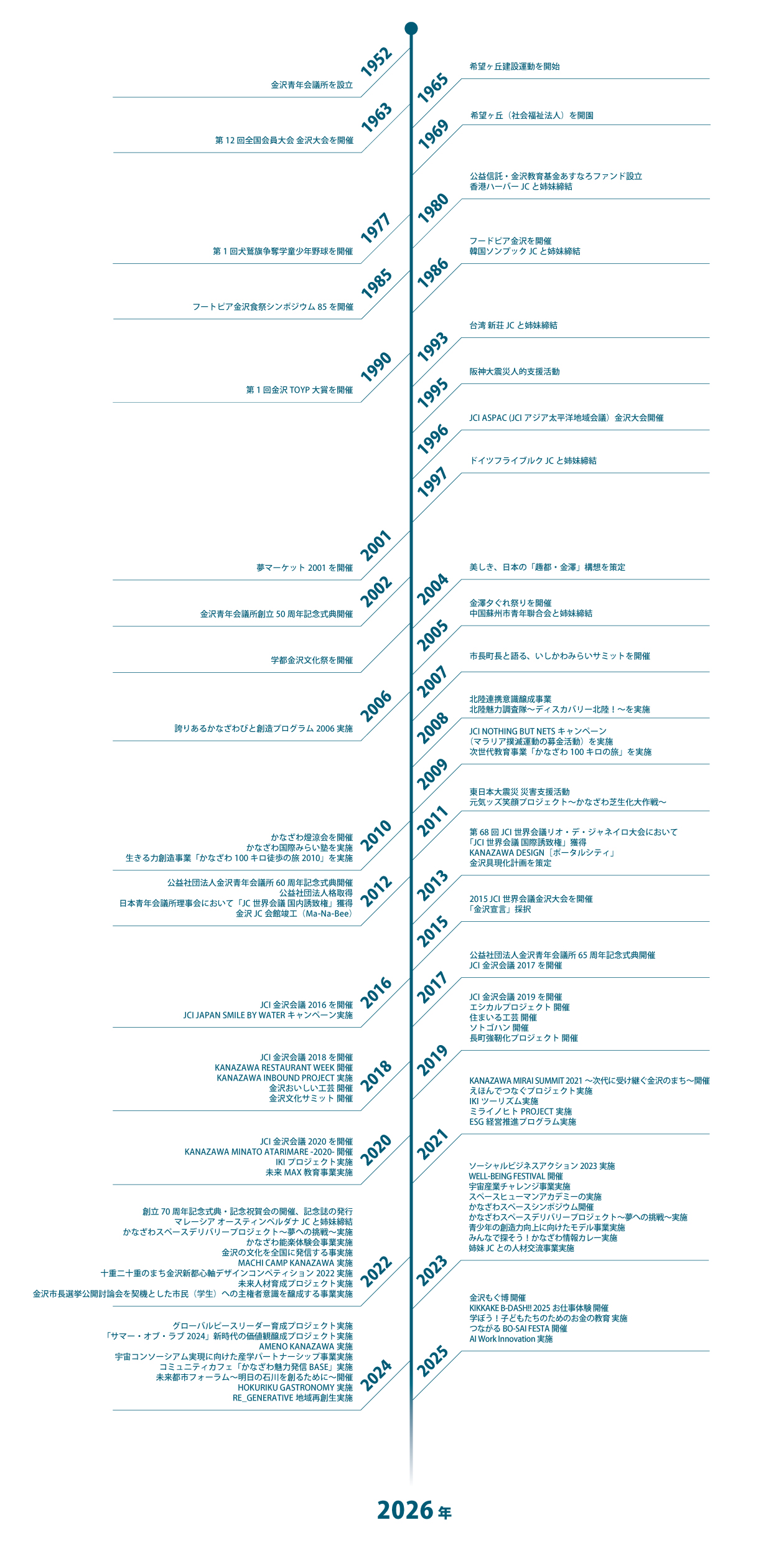 世界の国と地域で約120ヶ国、約4,800ヶ所、約160,000名が各国の青年会議所に所属しており、日本全国では684ヶ所約30,000名が所属しています。県内では、9ヶ所に青年会議所があり金沢青年会議所は約200名が所属しています。