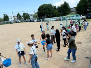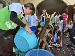 消防ブース:バケツリレー競争を行い、協力し合う体験を通じて地域で助け合う価値を体感。