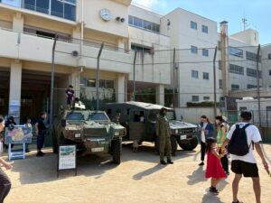 自衛隊ブース:車両展示、装備品紹介、VR体験、フェイスペイント体験など、非日常体験を通じ防災への関心を高める企画を実施。